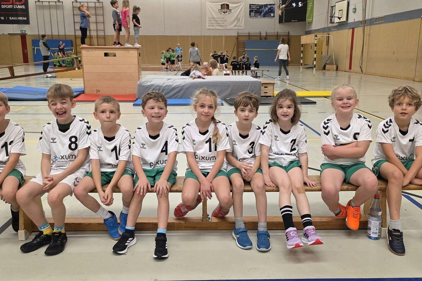Am vergangenen Wochenende waren unsere Minis zu Gast beim Spielfest in Saulheim. Nach dem Spielfest im Oktober in Alzey war bereits ein kleiner Fortschritt zu erkennen. Die Kinder setzen im Spiel immer mehr das um, was sie im Training gelernt haben: Zusammenspiel und Freude am Handball. Besonders schön zu sehen, jedes erzielte Tor wird ausgiebig gefeiert. In zwei Wochen steht schon das nächste Spielfest in Meisenheim an. Durch das neue System der Liga und die vielen Spielfeste haben unsere Minis die Möglichkeit, das im Training Erlernte immer wieder in der Praxis zu zeigen, was ihre Entwicklung enorm unterstützt. Das gesamte Trainerteam ist stolz auf die Fortschritte und die Begeisterung der Kinder.